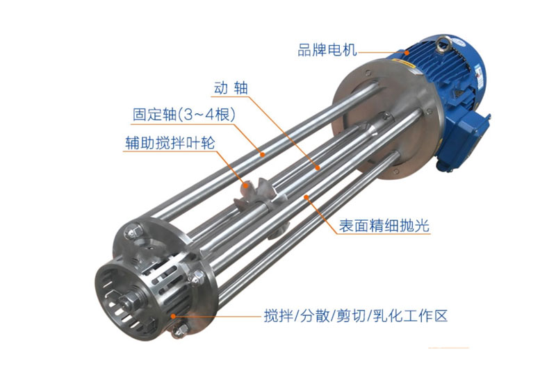 工作原理:主要工作部件由定子、转子组成。转子通过叶片高速旋转产生强大的离心力场,在转子中心形成很强的负压区,液液或固液的混合物从定转子中心被吸入,在离心力的作用下,物料由中心向四周扩散,在向四周扩散过程中,物料受到叶片的搅拌,并在叶片端面与定子齿圈内侧窄小间隙内受到剪切,然后进入内圈转齿与定齿的窄小间隙内,在机械力和流体力学效应的作用下,产生很大的剪切、摩擦、撞击以及物料间的相互碰撞和摩擦作用而使分散的颗粒或液滴破碎。物料在适量乳化剂和成熟工艺下经过一定时间反复循环解聚、分散、均质、细化、剪切产生稳定乳状液。